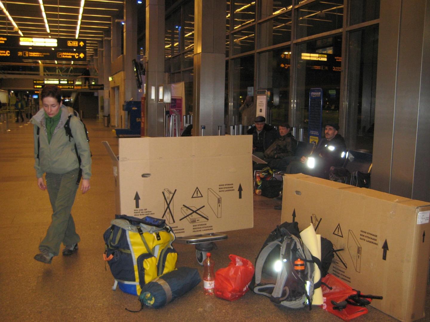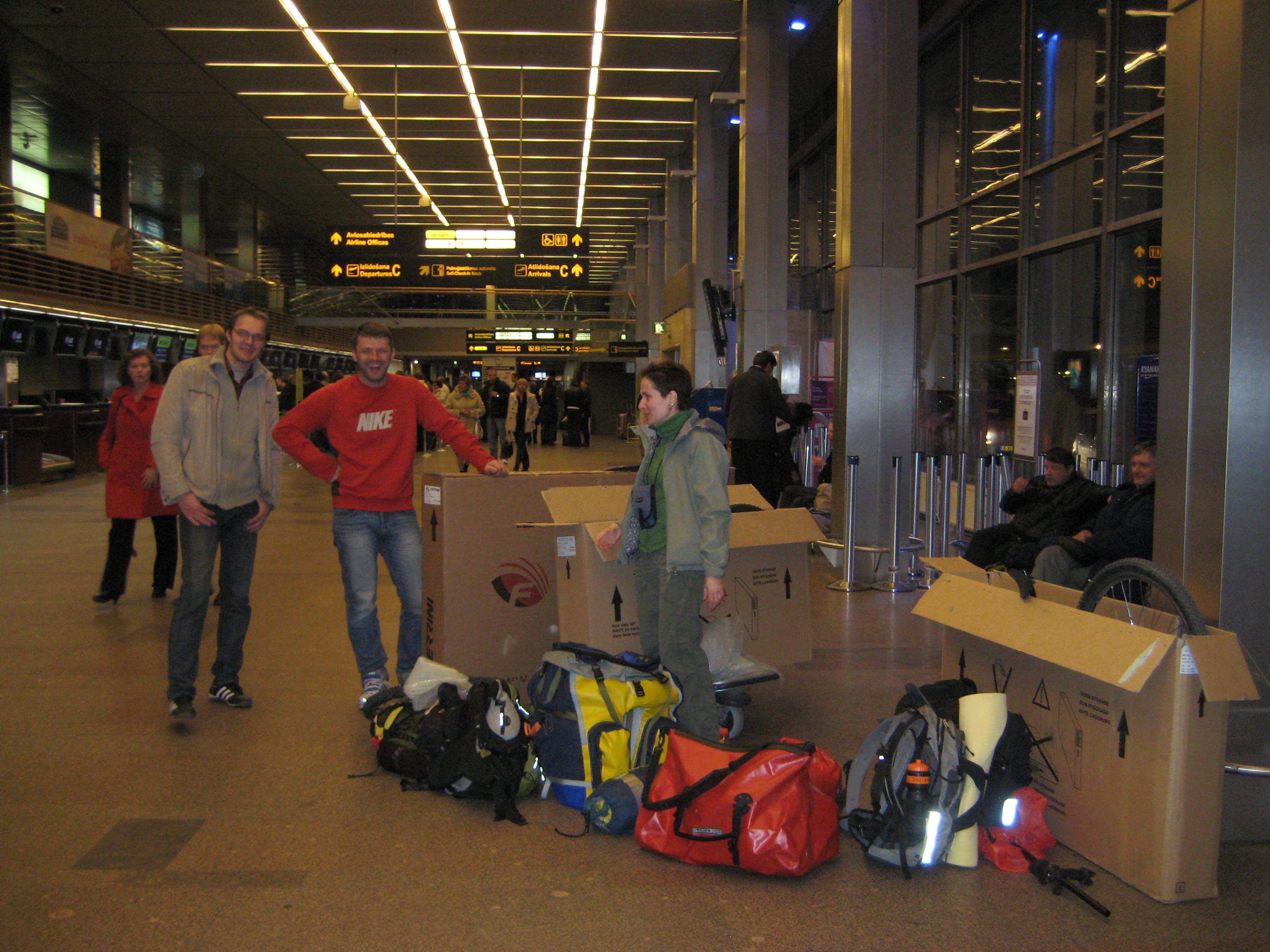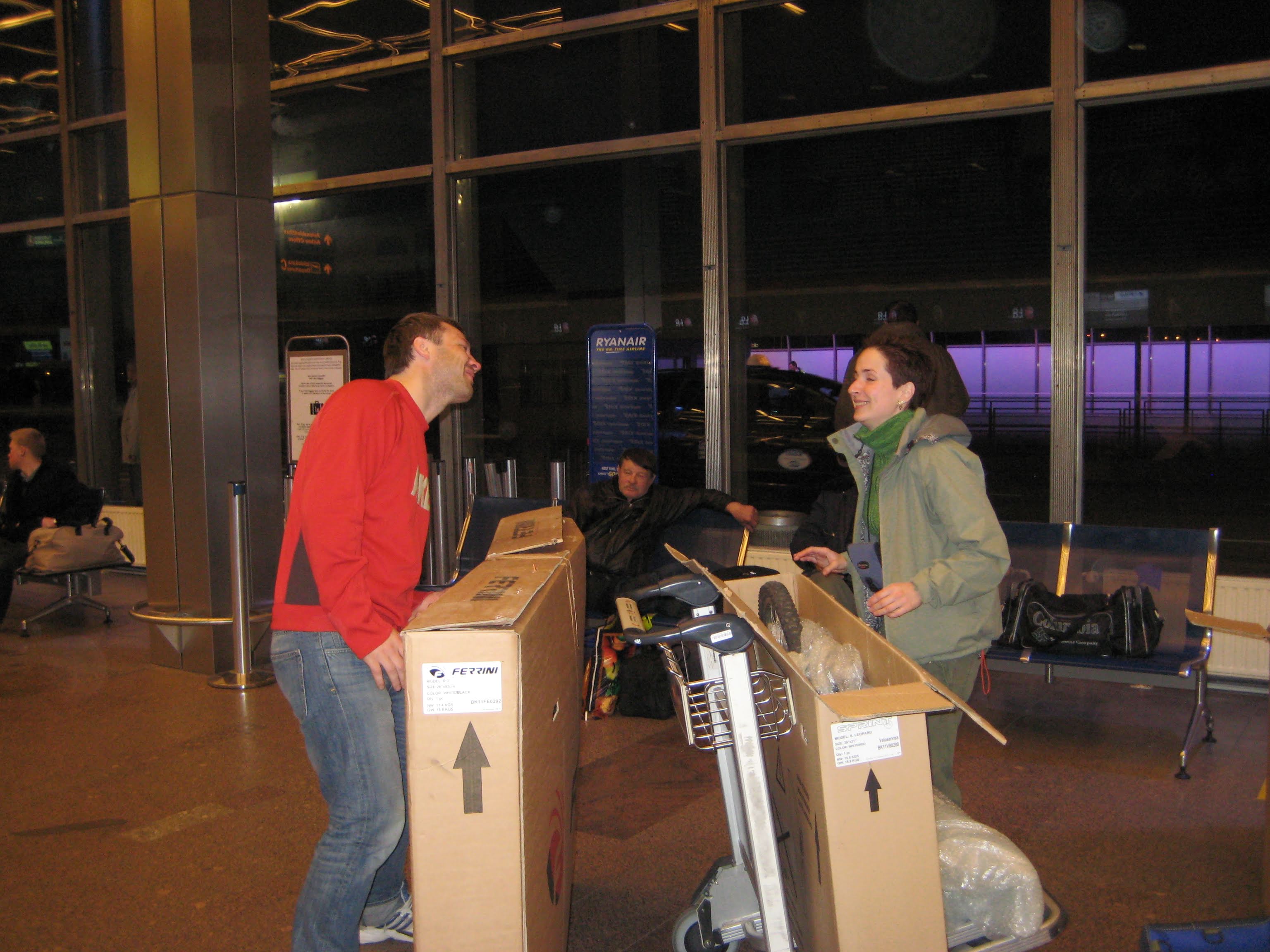 Вылетали мы по-моему в 6.20 утра. Сначала надо было добраться до аэропорта с великом, тут мне помог друг Юра с его катафалком марки Ауди- всё отлично поместилось. В 5 утра открывалась касса LOT и можно было оплатить велик. Вообще, велик у LOT проходит как спортивное снаряжение весом выше 15 кг и менее 30, и провоз его стоит 80 евро в одном направлении. Но Анна заговорила кассиру зубы, и он согласился, что если вы упакуем велики так, что весить они будут меньше 15 кг, то возьмут с нас только 40 евро с каждого, как за лёгкое спортивное снаряжение.