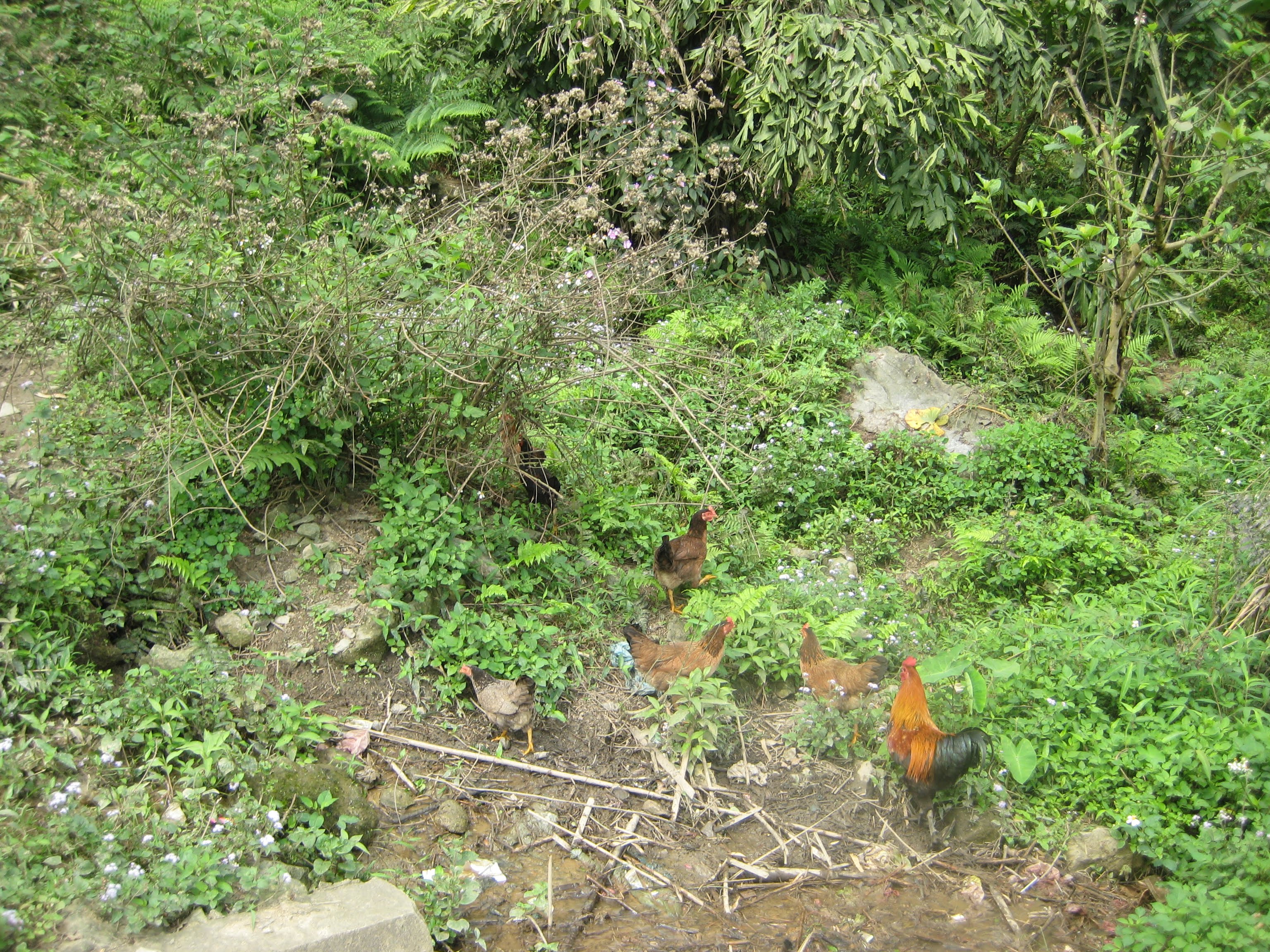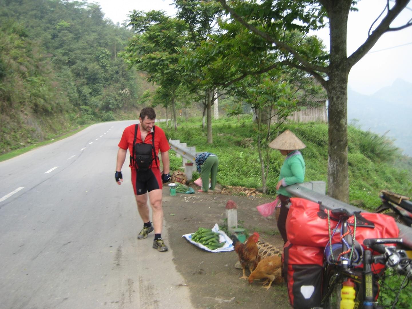 Огурцы стоили 36 сантим за 6 штук. Вода и газировки, кстати, стоит примерно полдоллараза бутылку или банку, размер и типа напитка при этом имеют мало значения. Рядом с огурцами продают куриц, которые обычно сидят в тесных клетках. Нужно это потому, что клетки возят на мотобайках, как и всё остальное. Как видите, продавщица в шапке-"вьетнамке". Это вполне обычный деревенский головной убор, а вовсе не сувенир для туристов.