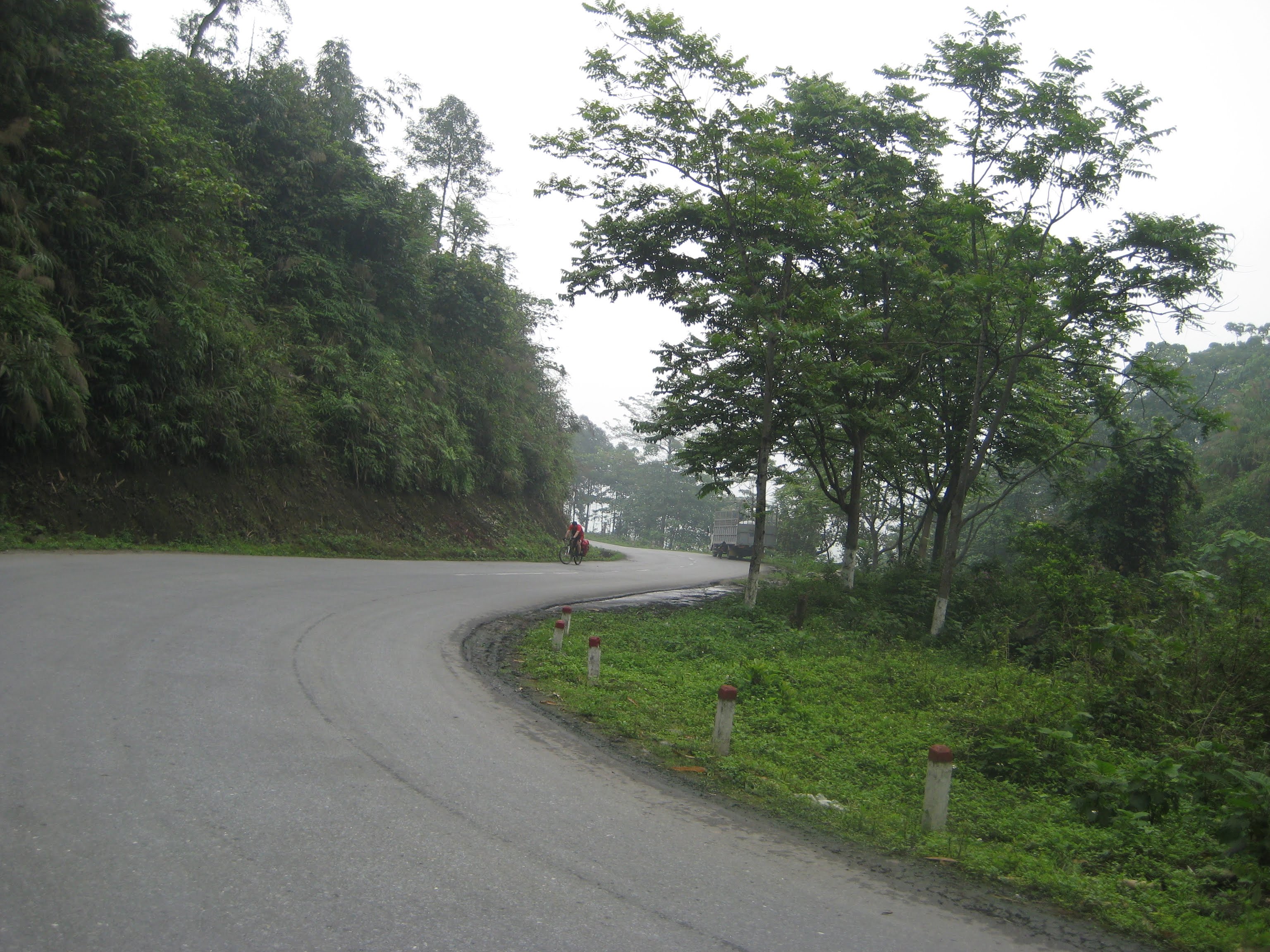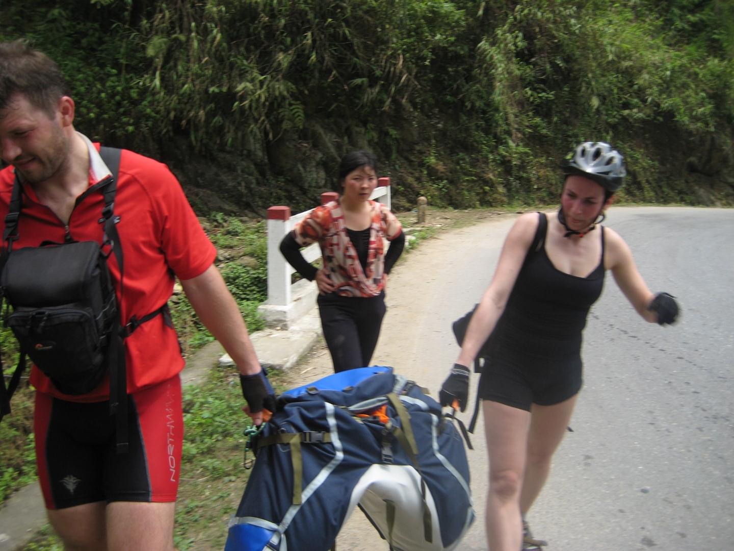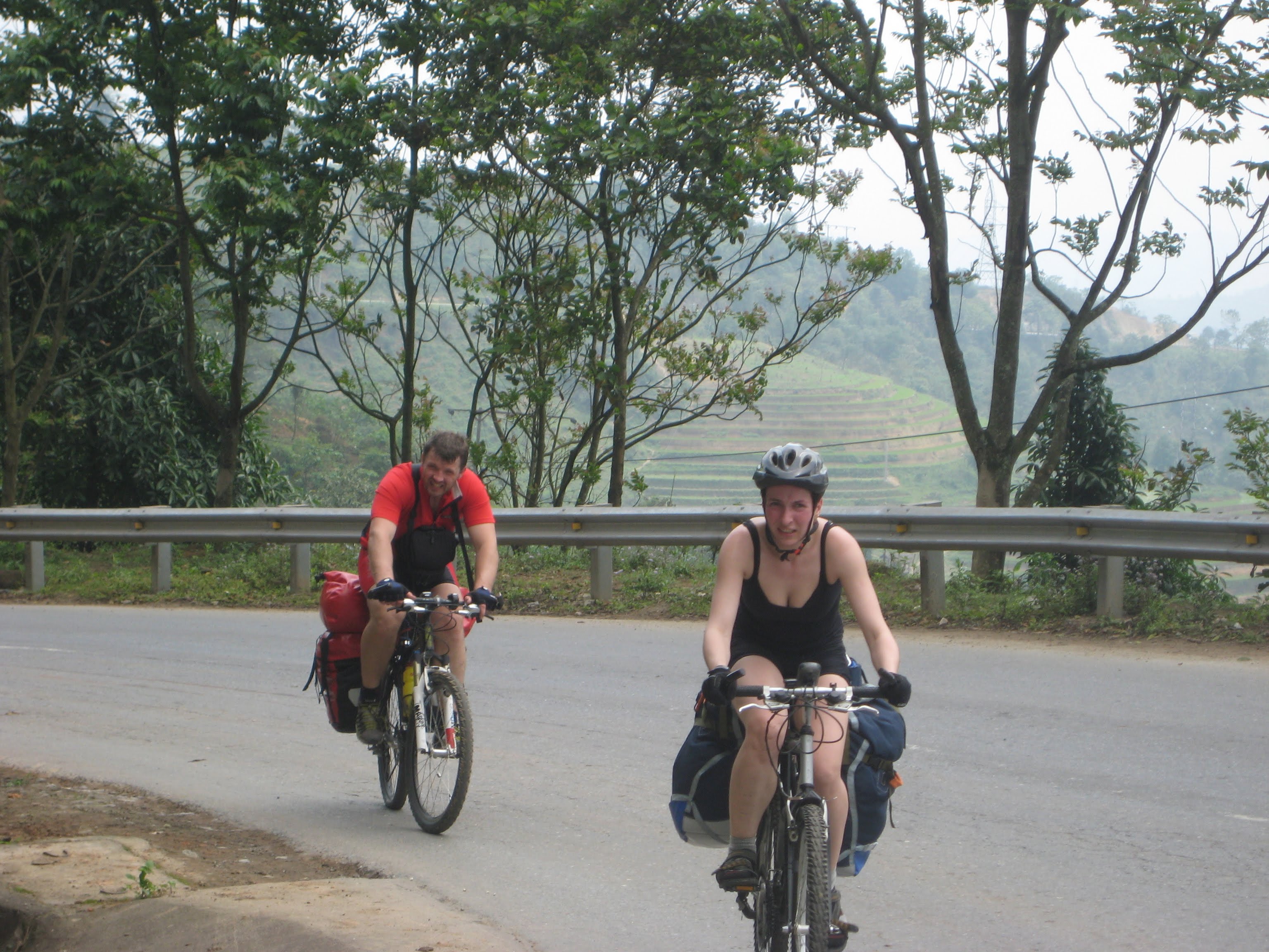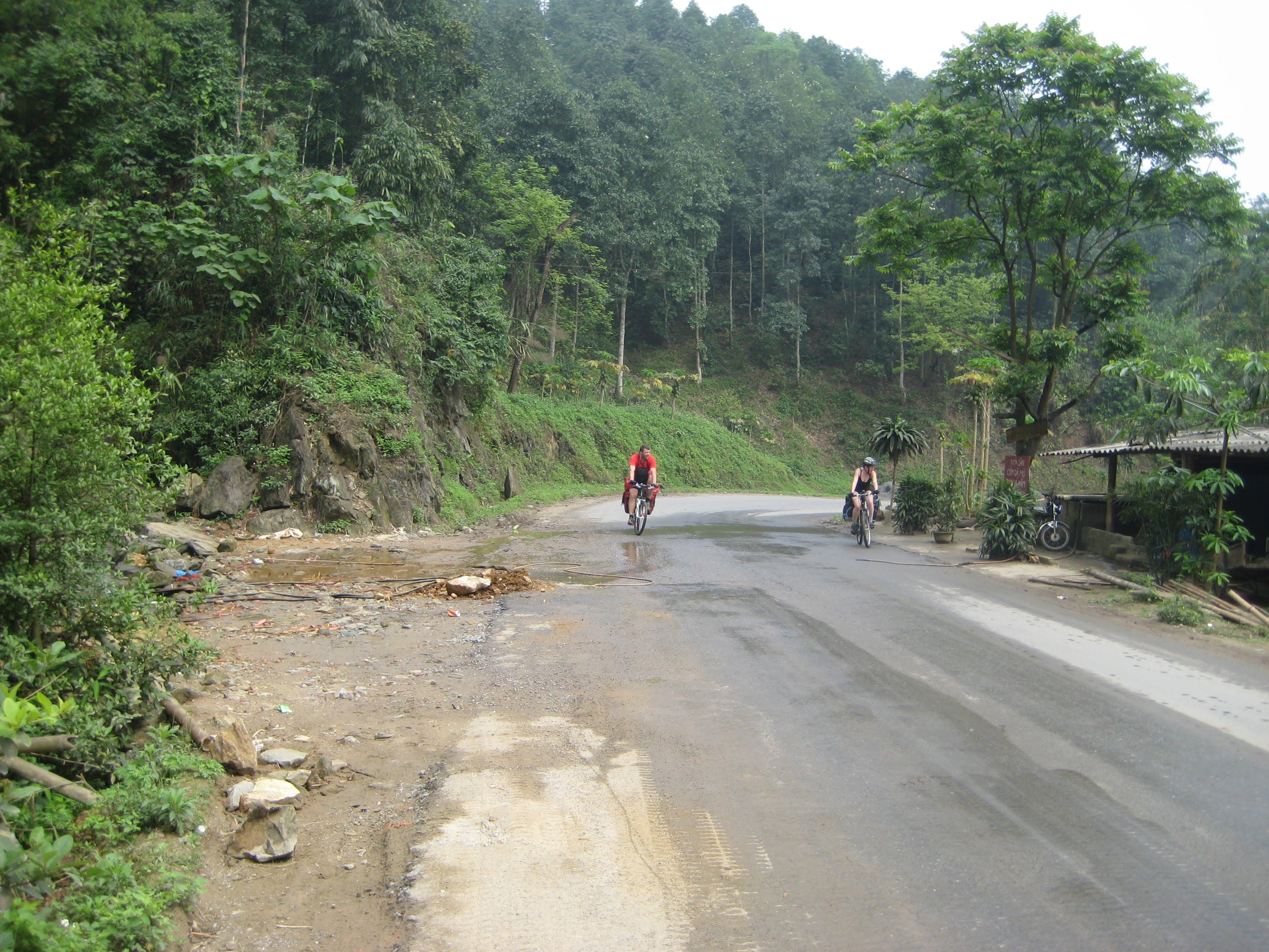 Когда мы проехали около 15 км (судя по моему GPS, хотя товарищи говорят, что 20), мимо нас проехал полурейсовый бусик Лао Кай - Сапа. Парень и девушка внутри не спеша ждали, пока мы решим, достаточно мы на сегодня намучались на горных дорогах, и хотим ли доехать с комфортом.