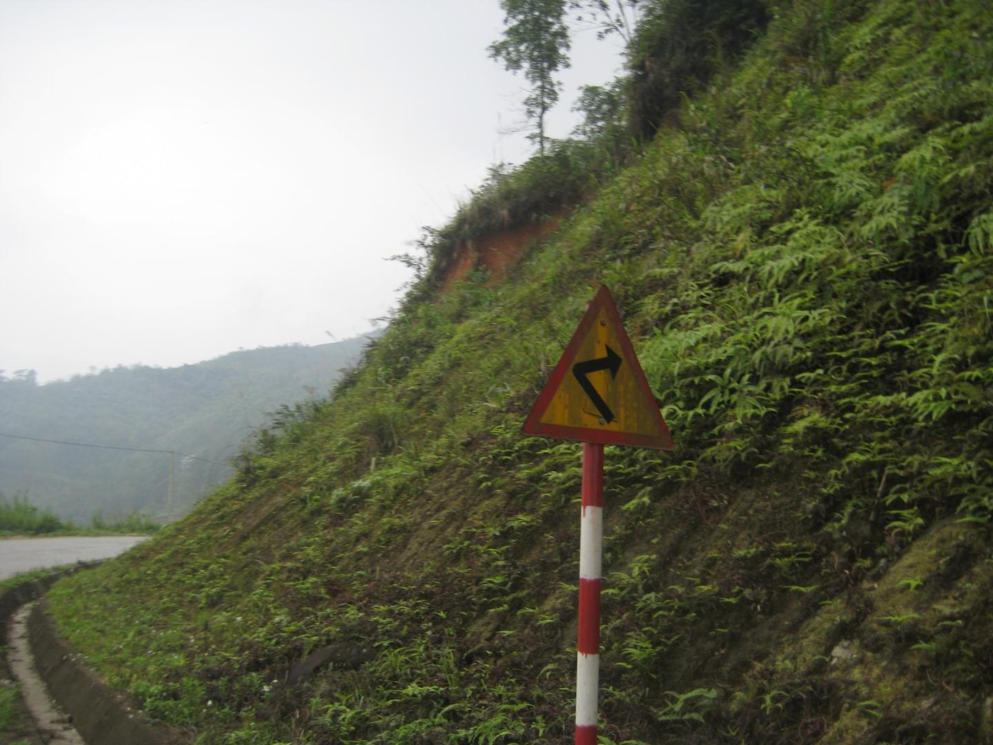 Таких очень много, потому что повороты везде крутые. Знак жёлтый, с красной окантовкой, стрелка изогнута резко. Знаки все старые и неприглядные, и даже новый он, судя по подтёкам краски, был покрашен небрежно. Это во Вьетнаме норма - лишь бы процесс шёл как-нибудь, а детали не так и важны. В принципе, неплохой подход - нервы не портить европейским перфекционизмом.
