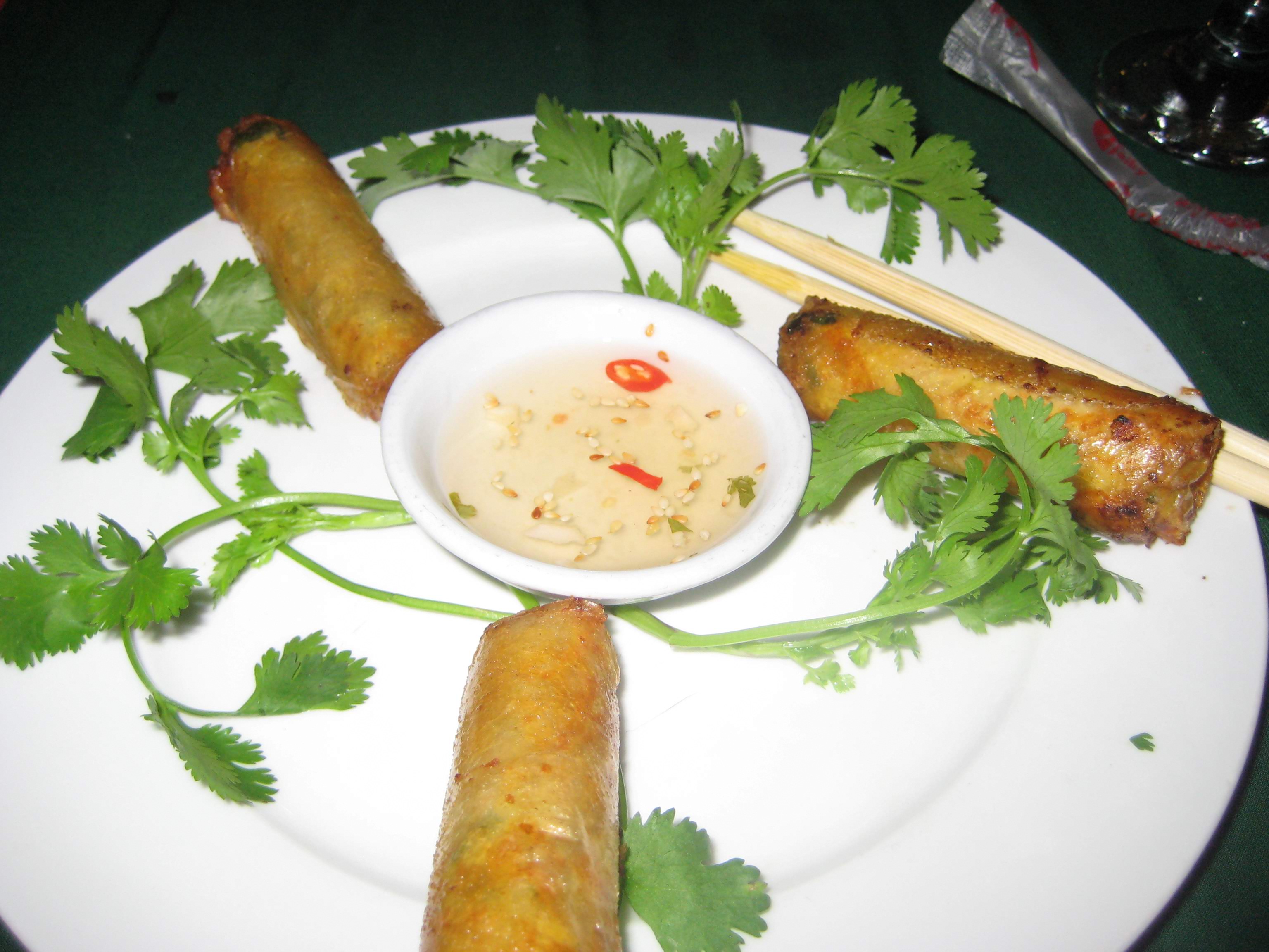 Роллы, то есть завёрнутая в рисовую бумагу или капусту начинка из мяса и овощей, были хорошие и хрустящие. Соус в центре - острый и вкусный. Потом ещё было мясо в хотплейте, суп и pancake, оказавшийся на поверку обычным тонким русским блином в единственном экземпляре.