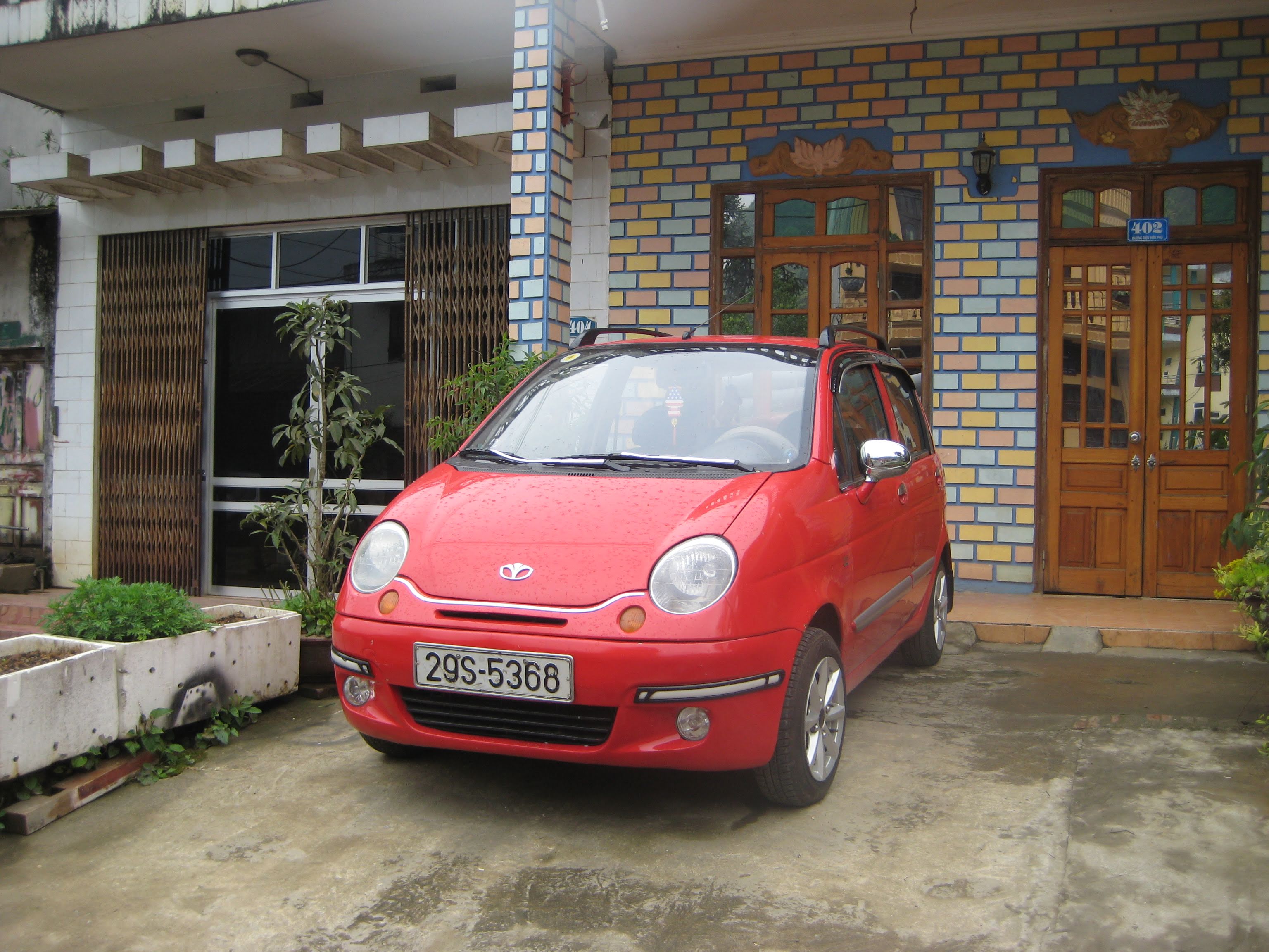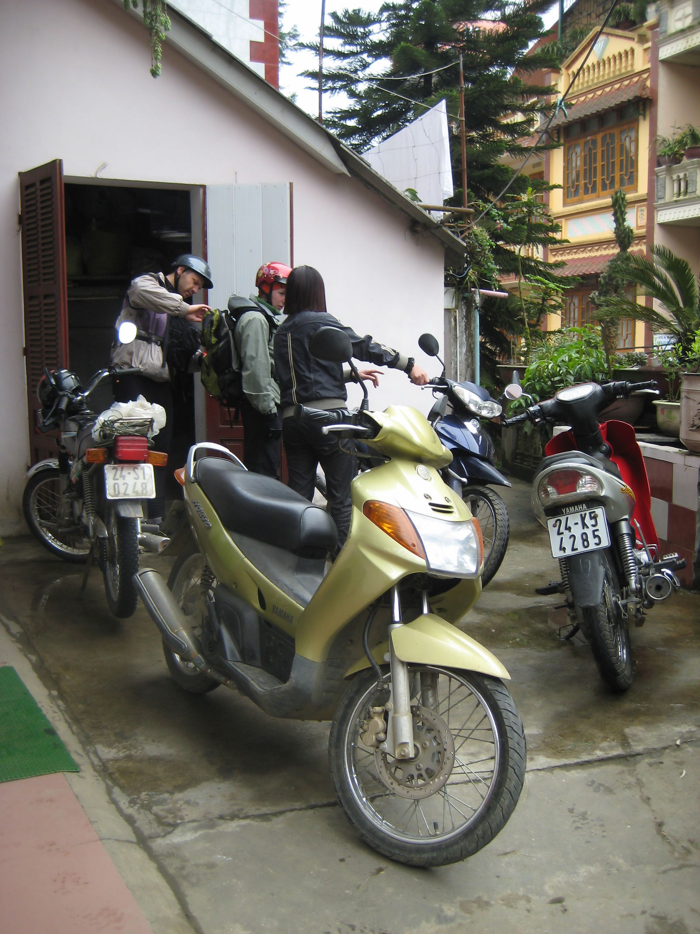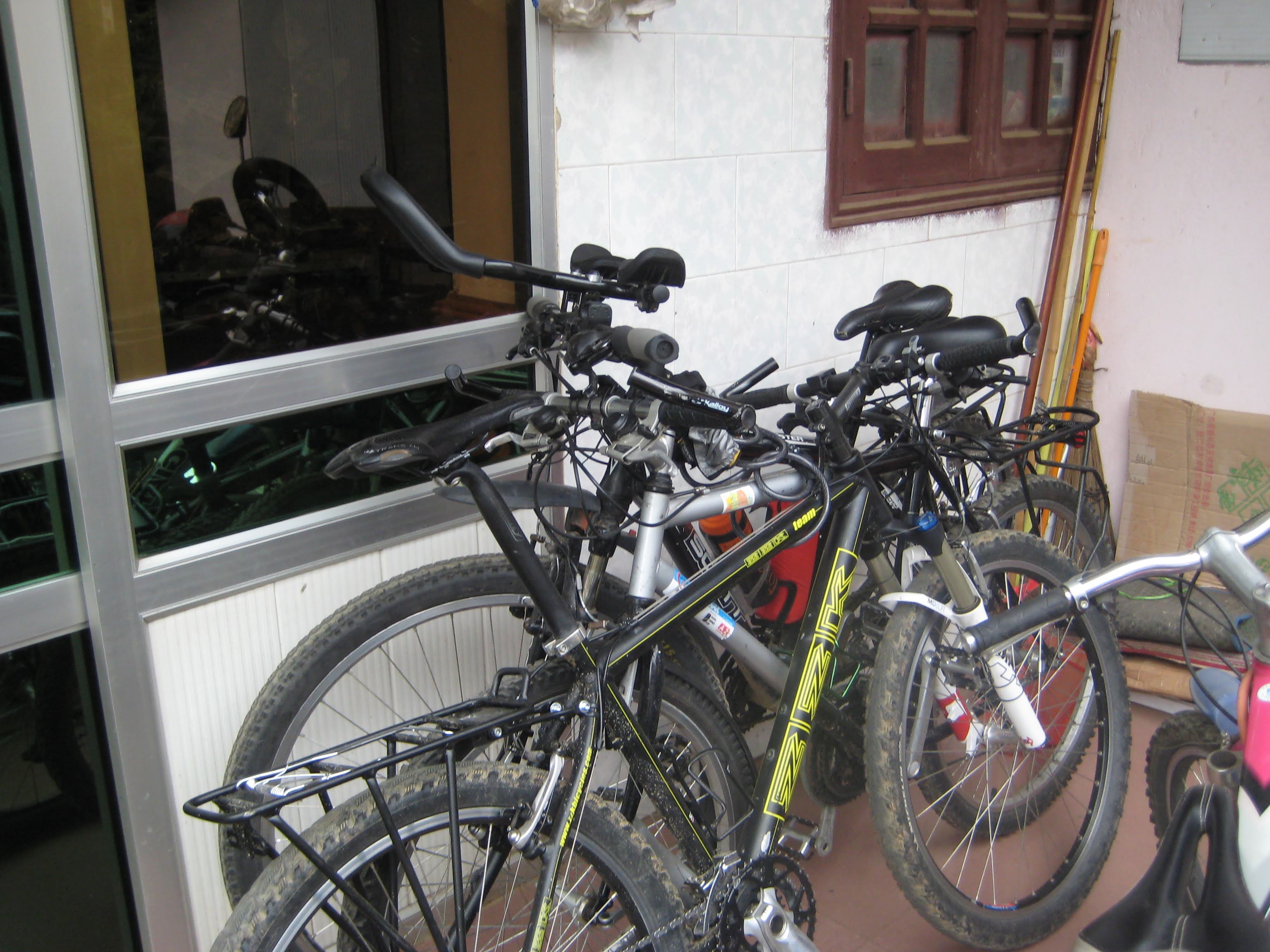 Мотобайки хранились на маленькой террасе отеля. Когда мы заселялись, спросили насчёт великов, можно ли их затащить в номер. Можно, сказали нам, но не нужно - потому что мотобайки стоят вне номера, и ничего. "Сколько стоит велик",- спросила Ня, - "мой мотобайк стоит 1200 долларов и стоит на террасе". Осталась почти без ответа, потому что Интар был против таких разговоров, а мой велик стоит всё-таки меньше 1200 долларов. В итоге мы просто сцепили велики вместе замком, и оставили так. У меня на велики есть сигнализация с dealextreme, но в Латвии я не успел купить батарейку, а в Сапе с батарейками на 9 вольт типа "крона" напряг - есть только цинковые, не алкалиновые, да и те просроченные.