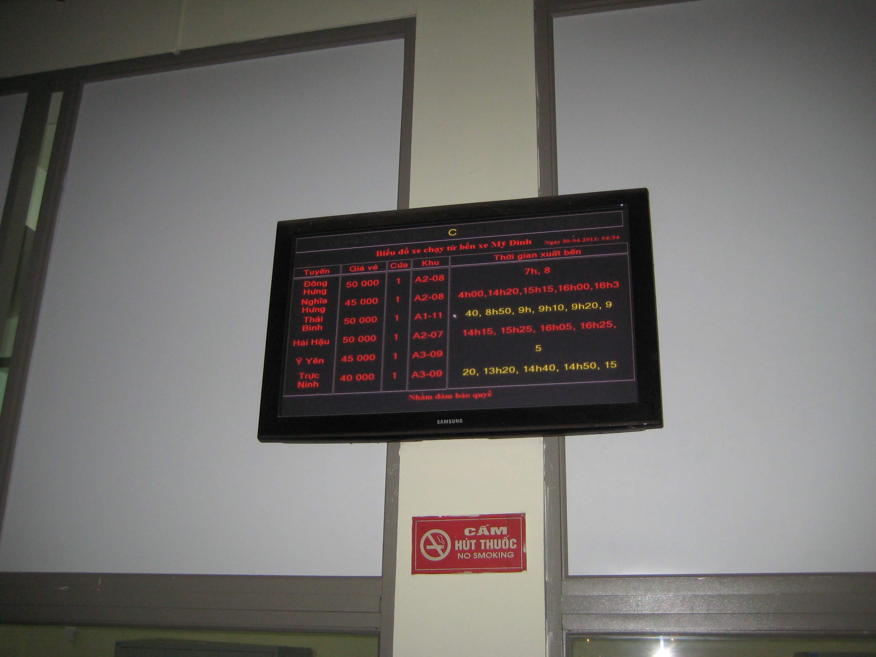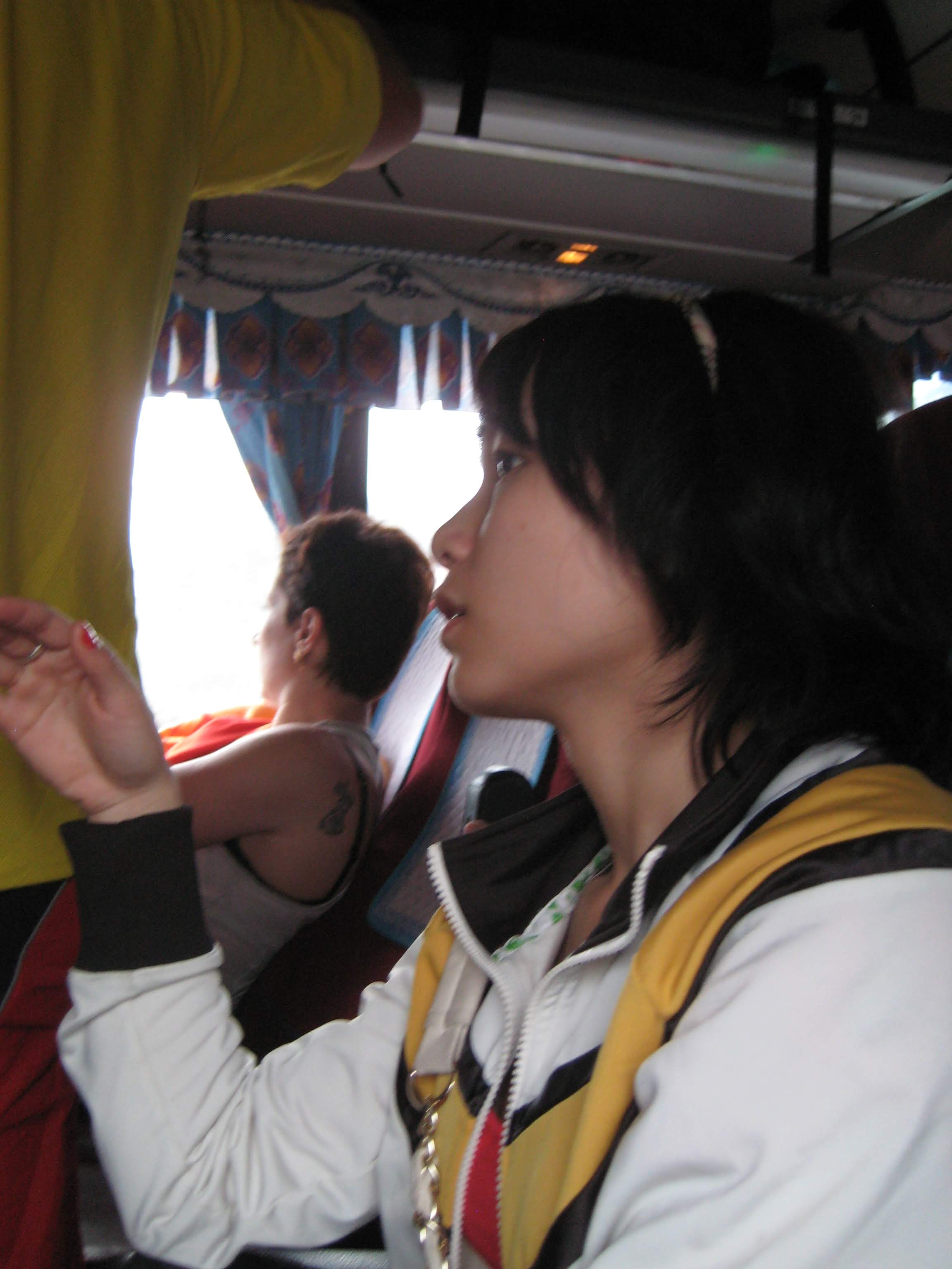На следующий день мы отправились в знаменитую бухту Халонг. Это был день 31 апреля, большой праздник во Вьетнаме, и в Халонге, как курортном городе, ожидалось очень много народу, поэтому Туи нам отсоветовал туда катить. Но выбора у нас особо не было, поэтому мы ломанулись, для чего встали в 5 утра и взяли такси на вокзал. Нам Туи заранее сказал, автобус какой компании брать, но кассах ещё никого не было, а на прочие люди не очень-то говорили на английском и горели желанием нам помочь в 6 утра. Пришлось садится в первый попавшийся автобус, благо таких, что едут в Халонг, были кучи. Завлекают туда спец. менеджеры - вообще, во вьетнамских автобусах есть менеджеры, которые зазывают пассажиров, собирают деньги за билеты, раздают тапки и так далее. Автобус, кстати, ехал не по расписанию, а когда был весь заполнен. Что означает во Вьетнаме "весь заполнен"? Это когда ещё в проходе пластиковые табуретки стоят, и на них люди сидят. Хорошо хоть не стоя едут.
