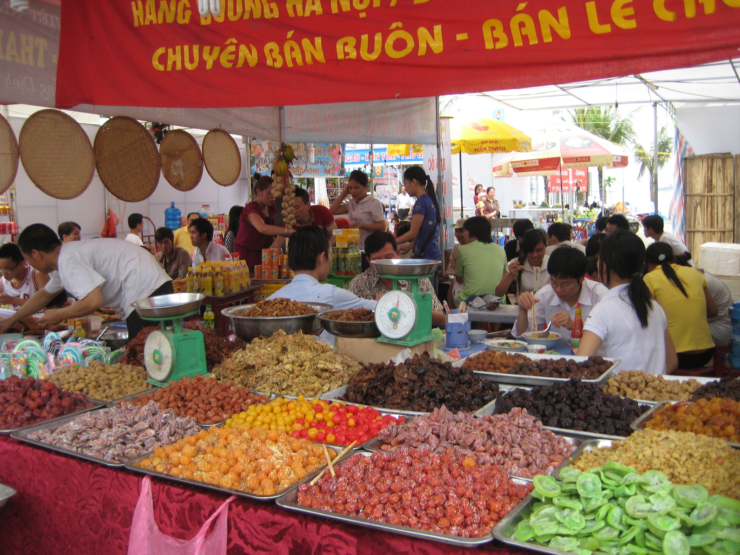 Фрукты тащат на коромыслах, как обычно. Я хотел купить такой намордник, но не нашёл. А вот шляпу купил