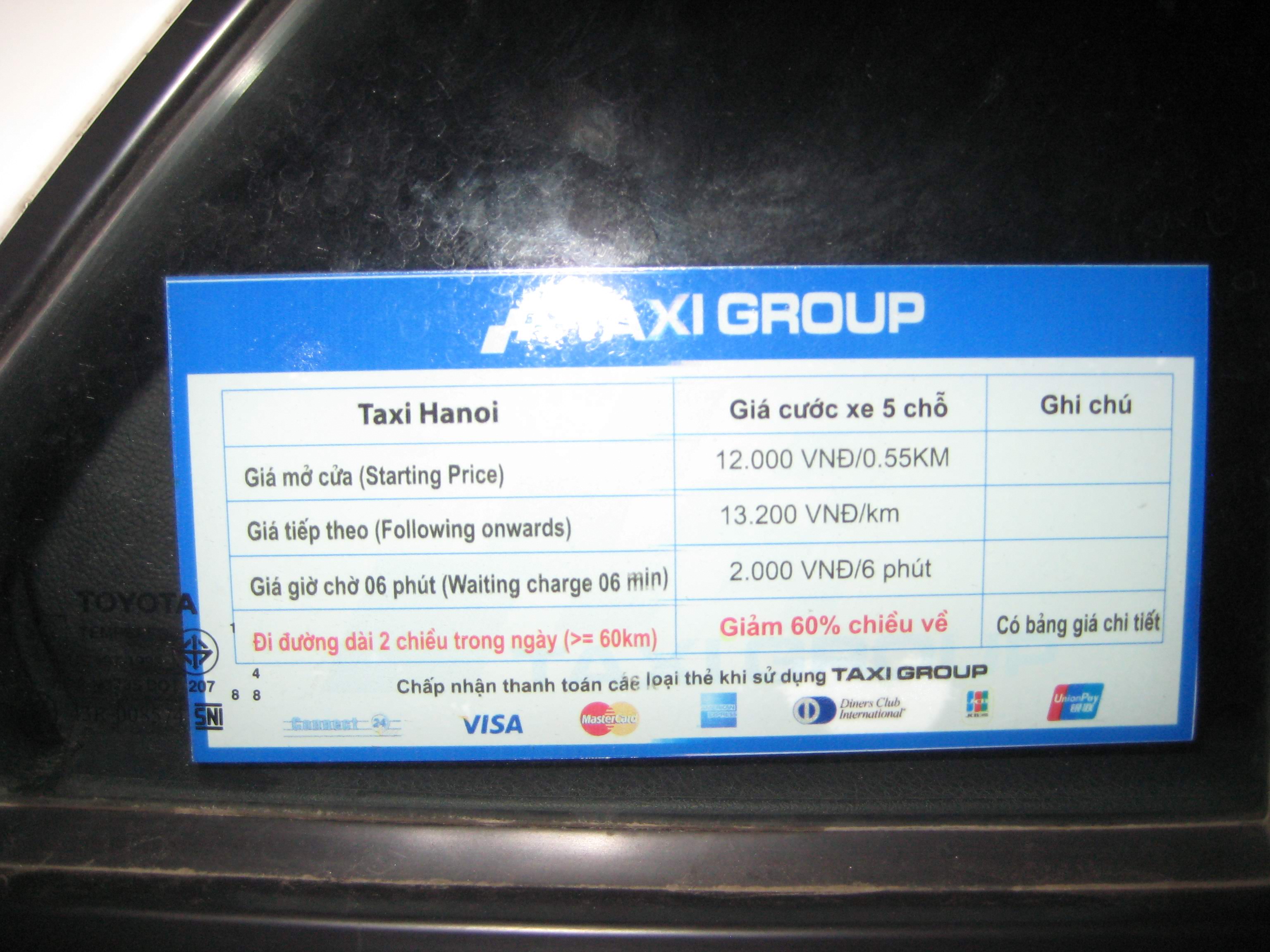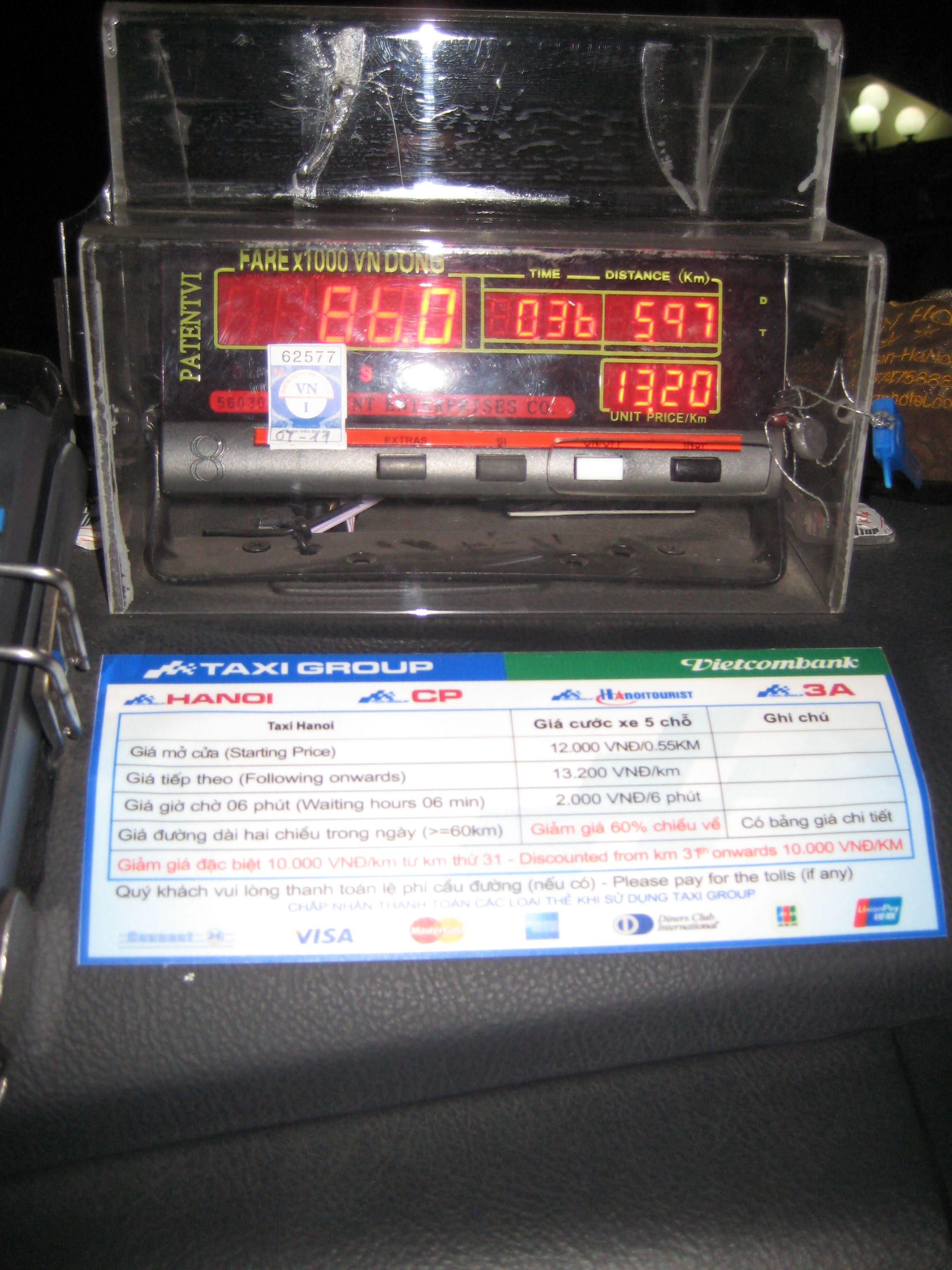 Такси в Ханое издят по счётчику, что-то около 32 сантимов за километр, то есть 65 буржуйских центов. Не все таксисты одинаково полезны - лучше брать такси мегакорпораций, вероятность проблем сильно ниже.