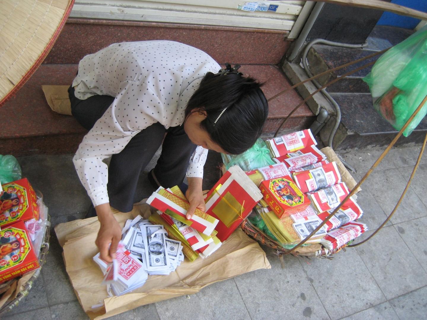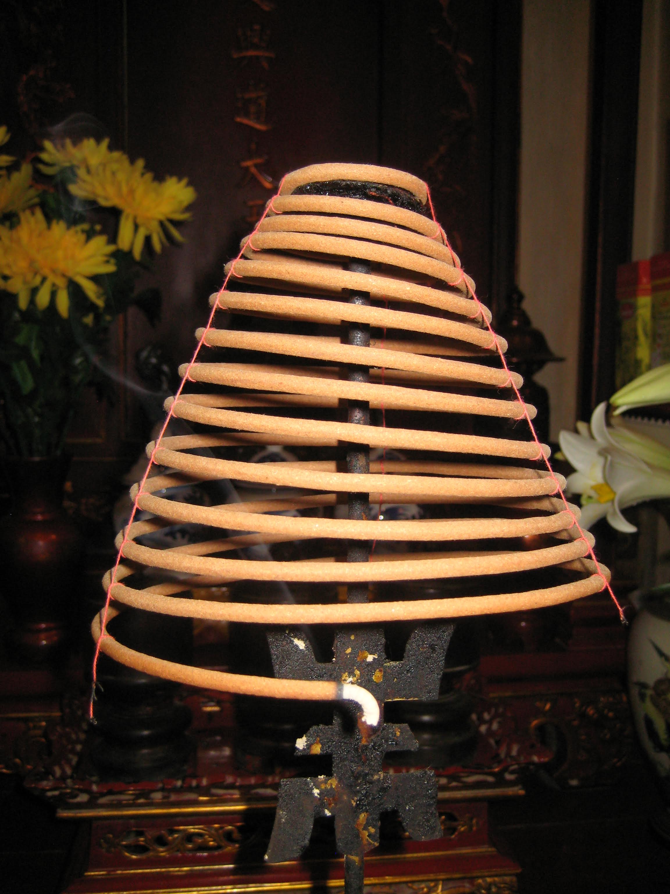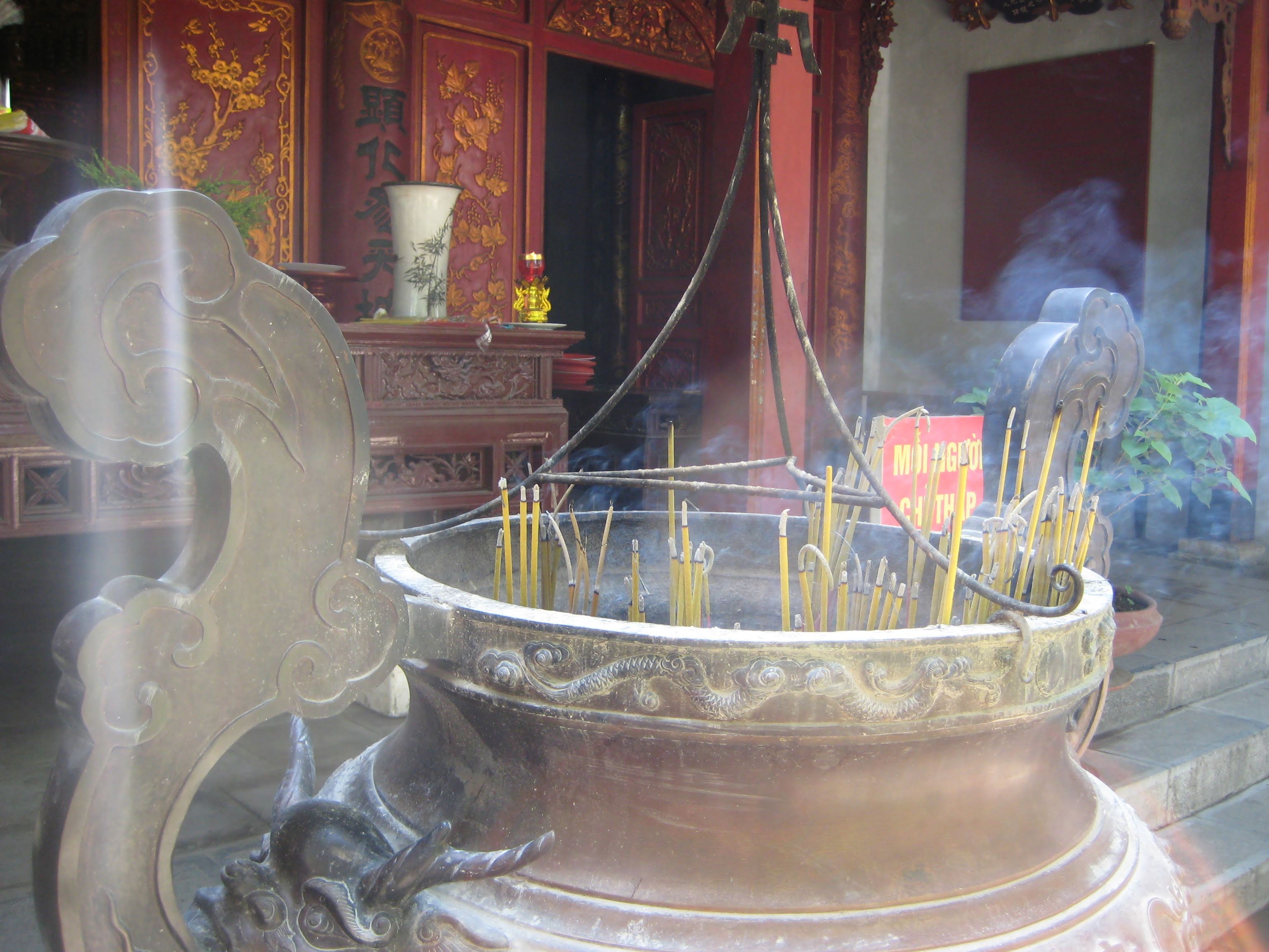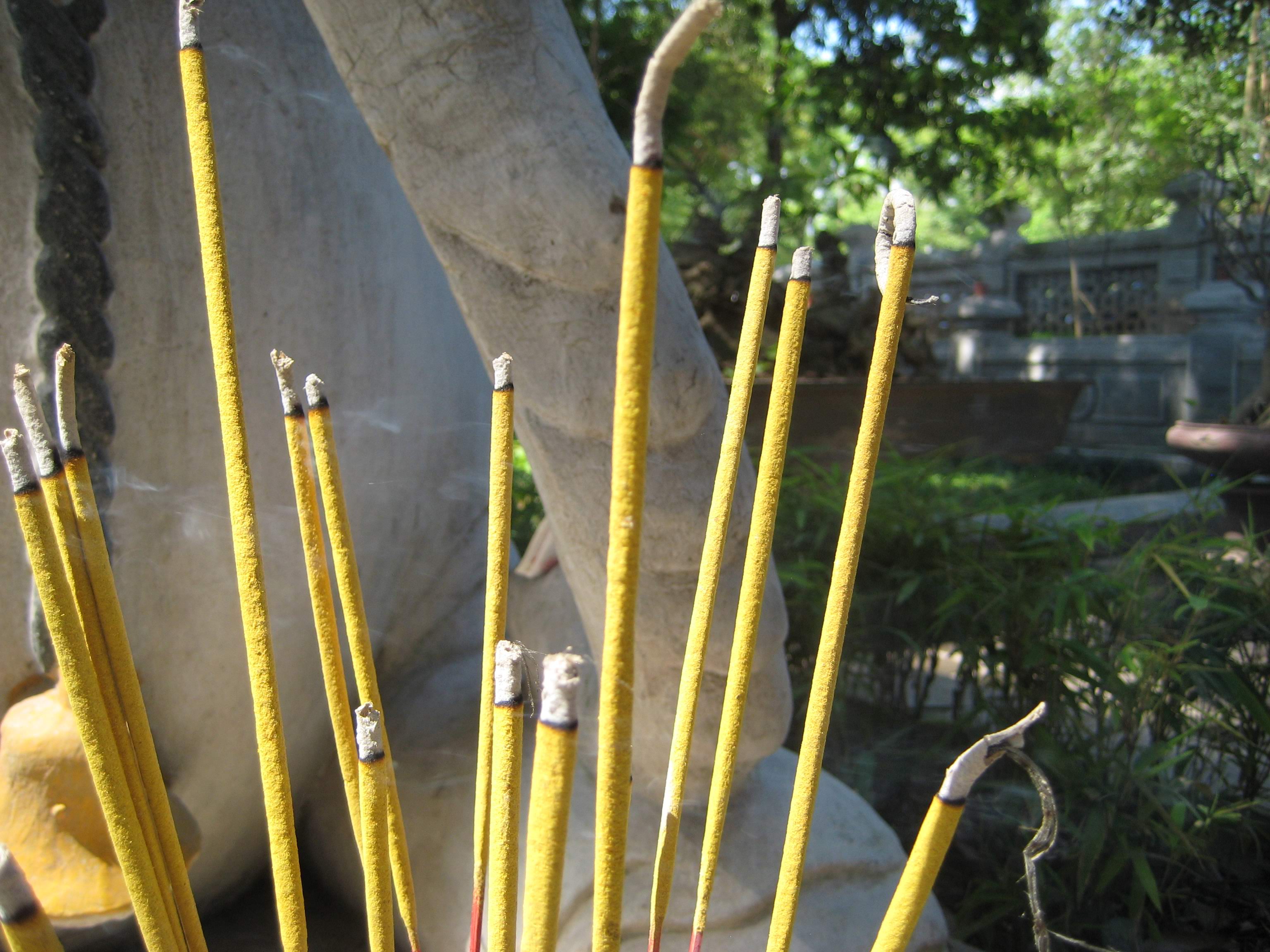 В храме благовония сложены пачками, можно взять и вставить в горшок. Деньги оставляешь самостоятельно, кладёшь в гору других денег, ну или в коробку можно пожертвовать.